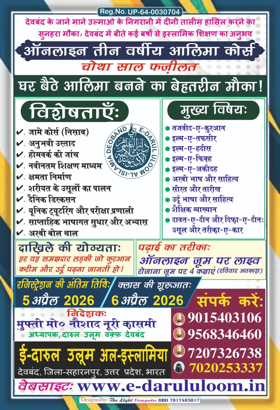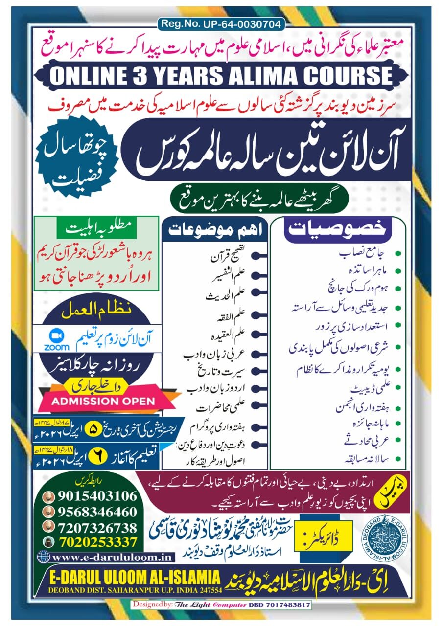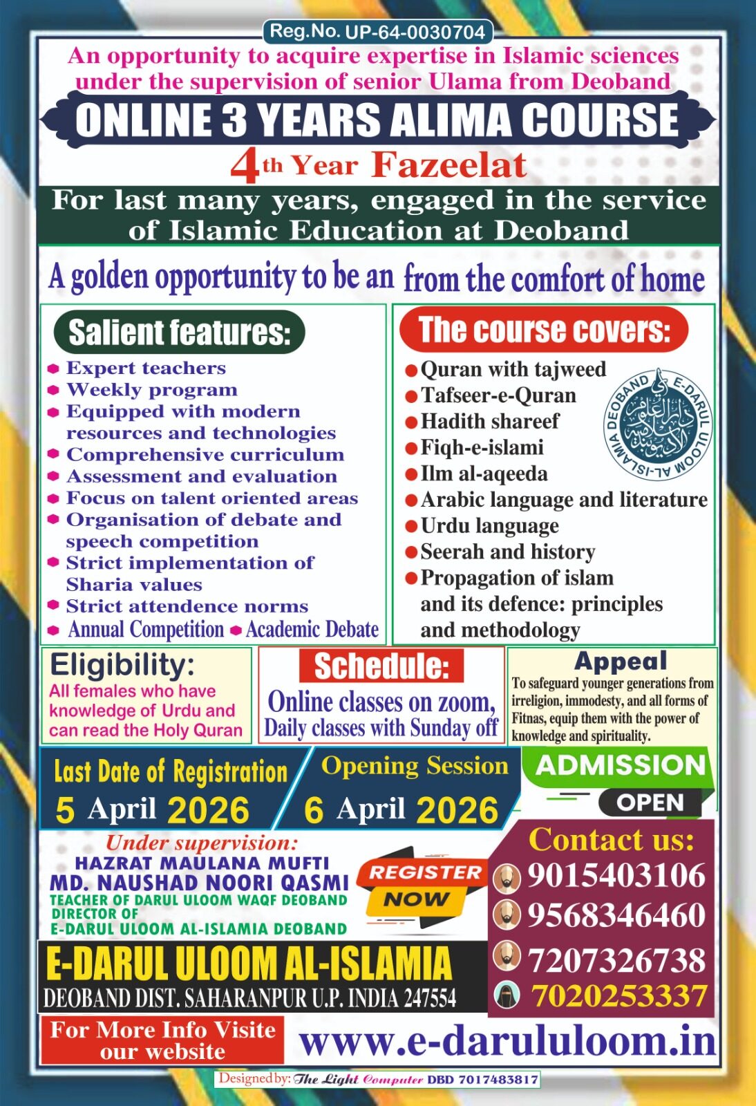 The “Al-Shari’ah Alimiyyah Course for Women” is a complete Alimah program specially designed for girls and young women. Any girl/woman who can read Quran and whose age is not less than ten years can get enrolled in this course. The duration of the course is three years, which is divided in six semesters. The classes are conducted online through “Zoom” six days a week (Monday-Saturday) in the evening. There will be four periods every day, and each period will be 30 minutes long. The classes go on throughout the year without any break except 15 day-long holiday on Eid al-Fitr and 5 day-long holiday on Eid al-Adha. Exams will be conducted at the end of every semester, and upon completion of the course, students will be conferred the degree of Alimah.