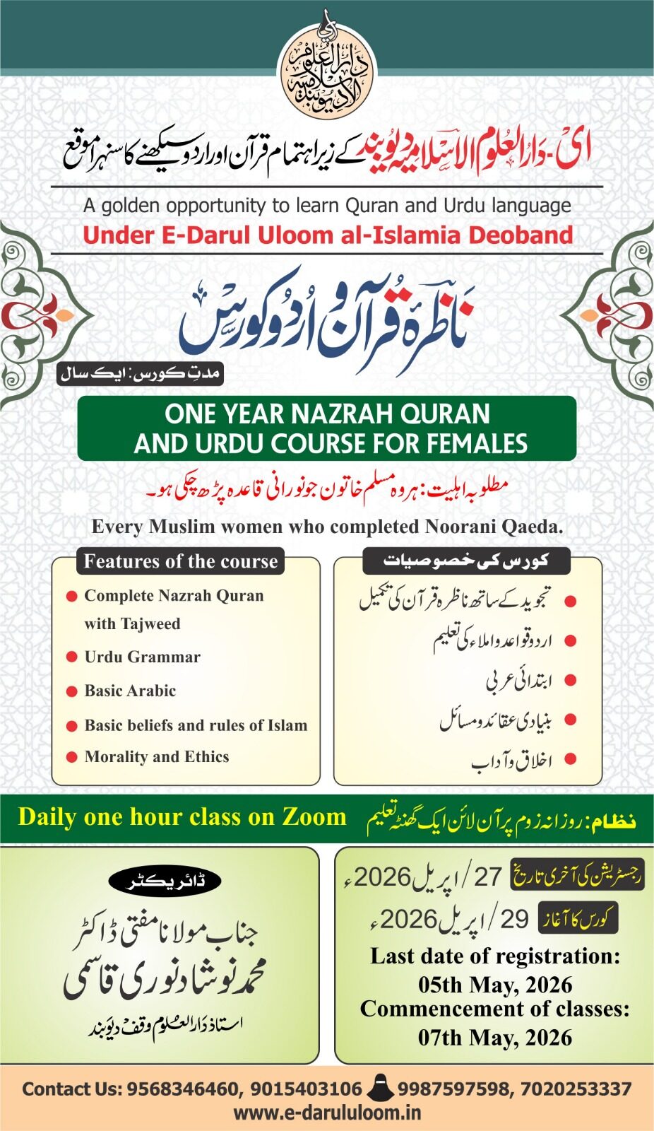 For ‘Three-Year Alimah Course for Women’, students must be able to read Quran Kareem and Urdu language.